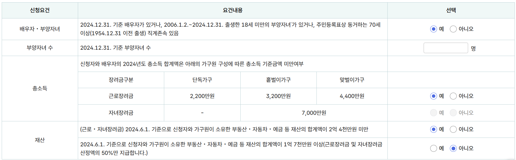 - 재산 기준 : 가구원 총합 2억 4천만 원 미만