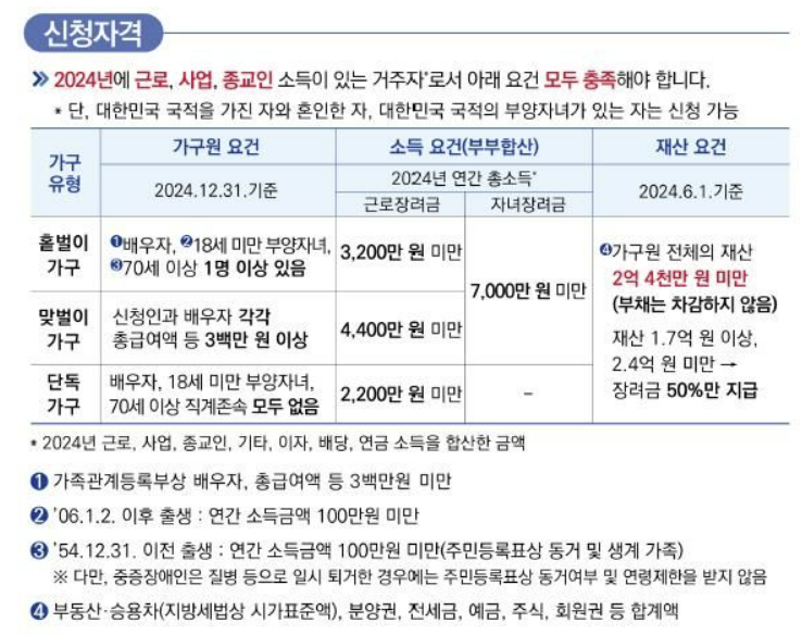 - 재산 기준은 근로장려금과 동일