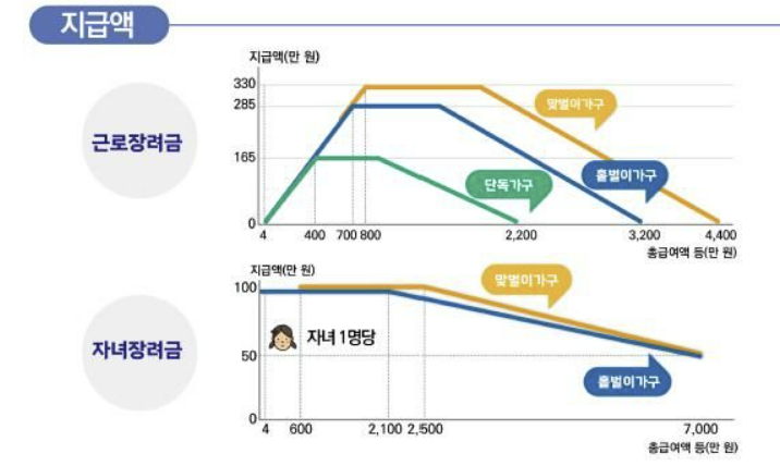 | 가구 형태 | 근로장려금 최대액 | 자녀장려금 (1인 기준) |