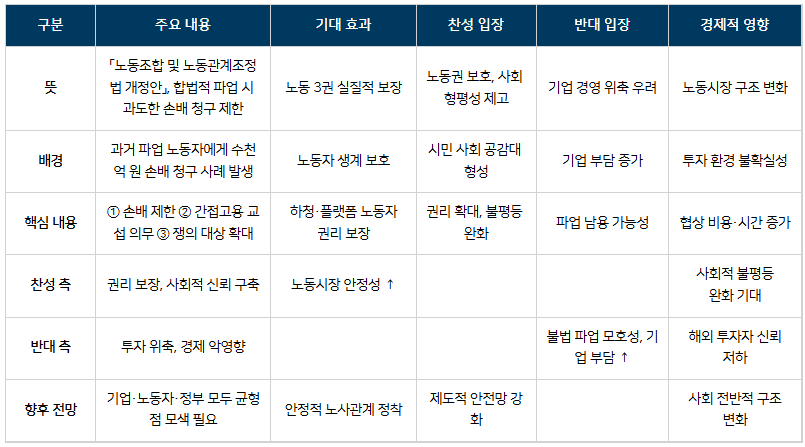 👎 반대 입장 - 기업 경영 불확실성 증가 - 합법/불법 파업 경계 모호 → 남용 우려 - 해외 투자 위축, 경제 전반 악영향 가능 |